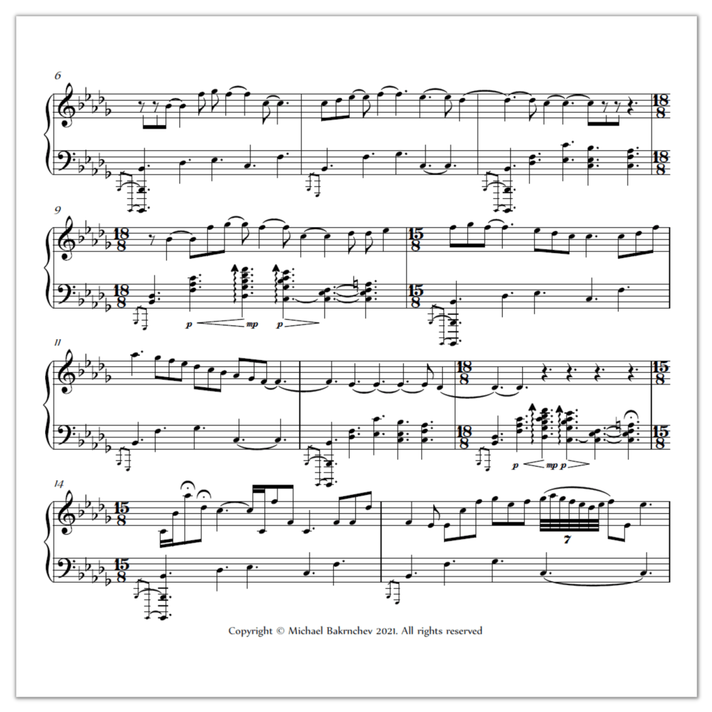 Excerpt (pictured right, b.6-15) of Bakrnčev’s Elegy for Piano.