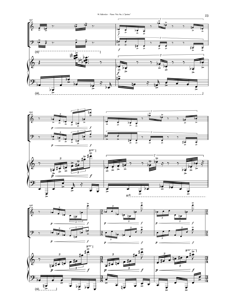 Excerpt (pictured right, b.142-148) of Bakrnčev’s Piano Trio No. 2 “Janino Oro”.