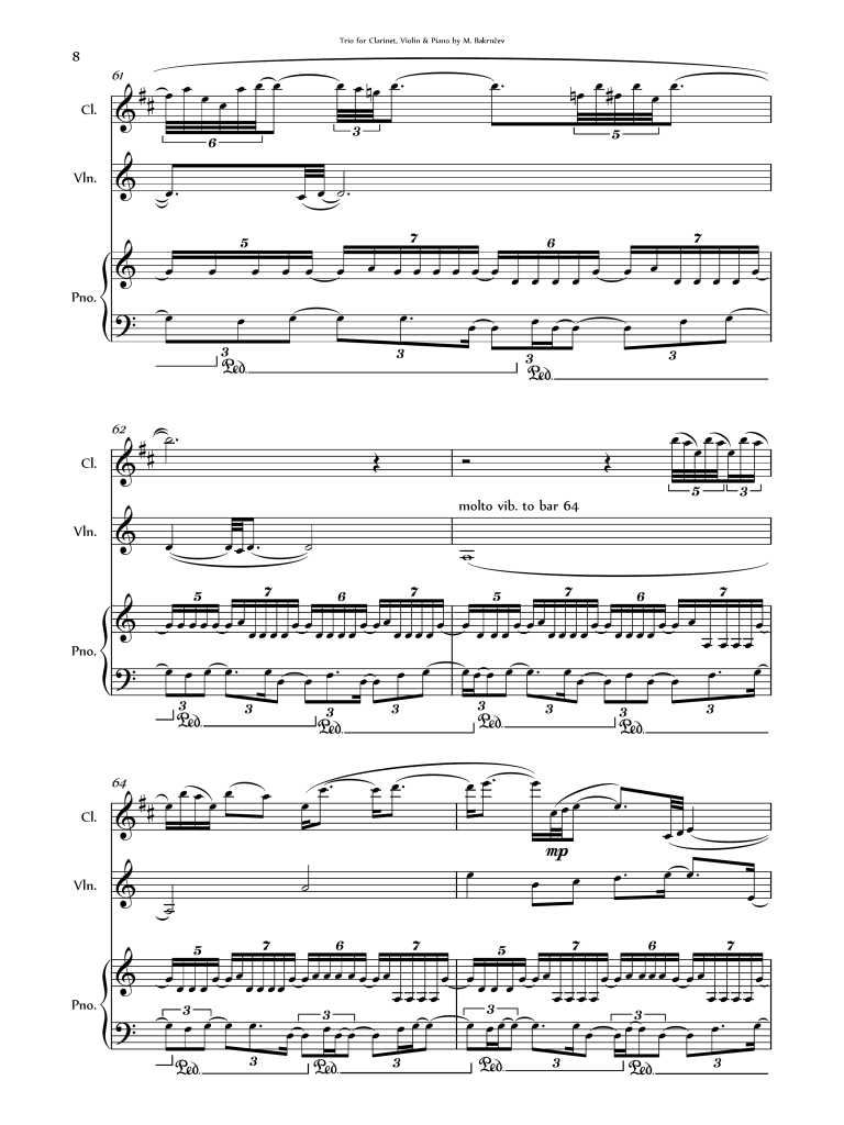 Excerpt (pictured right, b.61-65) of Bakrnčev’s Trio for Clarinet, Violin & Piano.